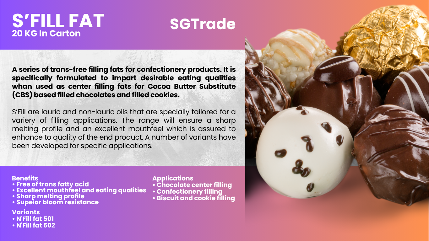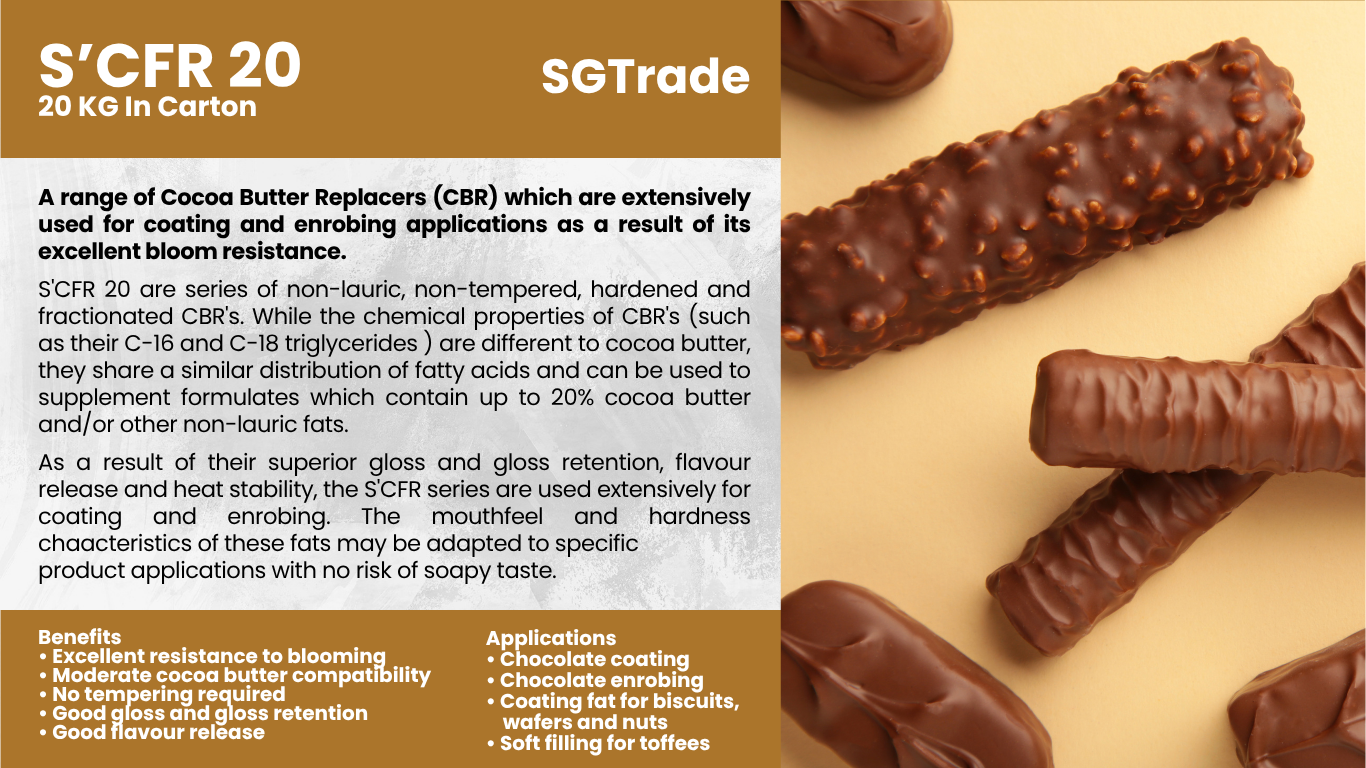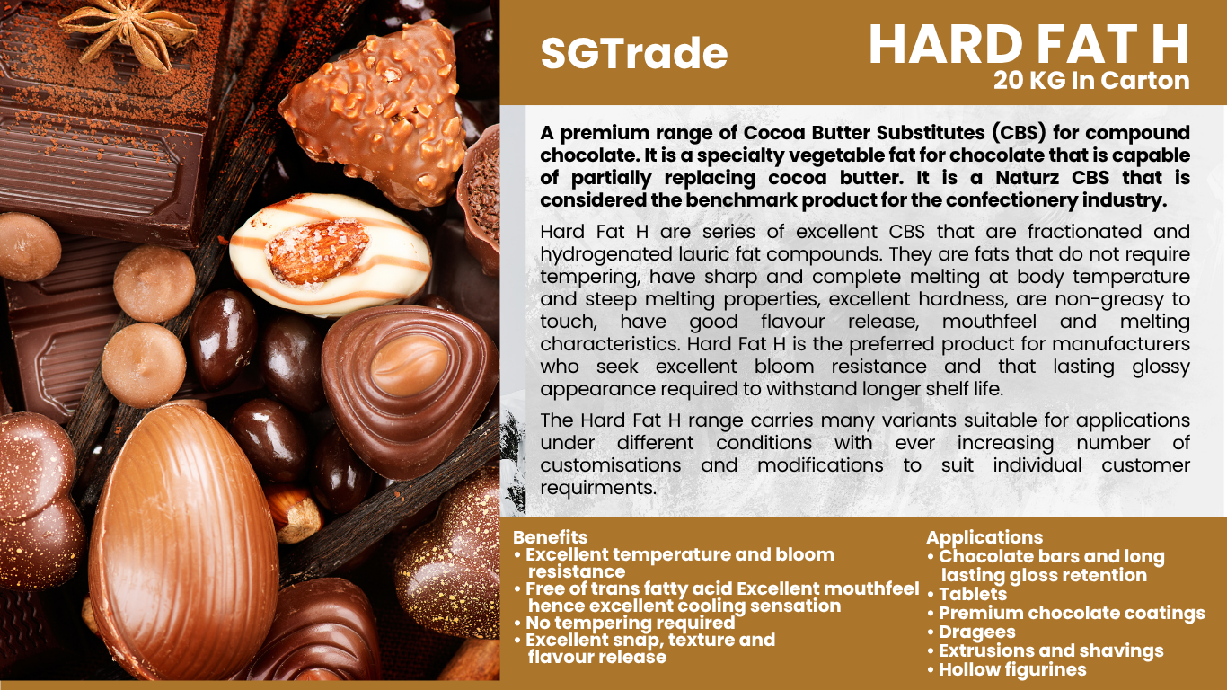Summit Global Trade supplies palm oil–based cocoa butter replacers and substitutes, providing smooth texture, rich taste, and heat stability for chocolates, coatings, and confectionery applications.