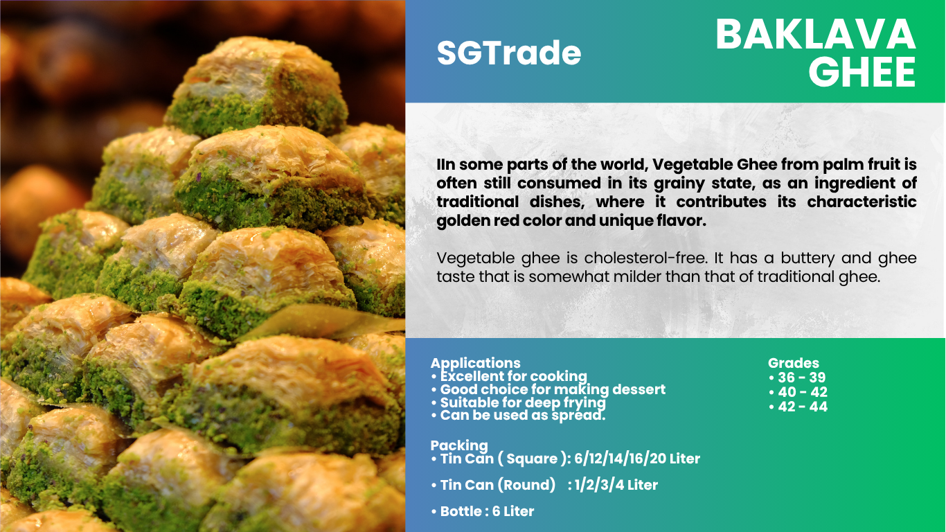 Summit Global Trade provides palm oil–based ghee alternatives and specialty fats, offering rich flavor, aroma, and stability ideal for traditional sweets, baklava, and culinary applications.