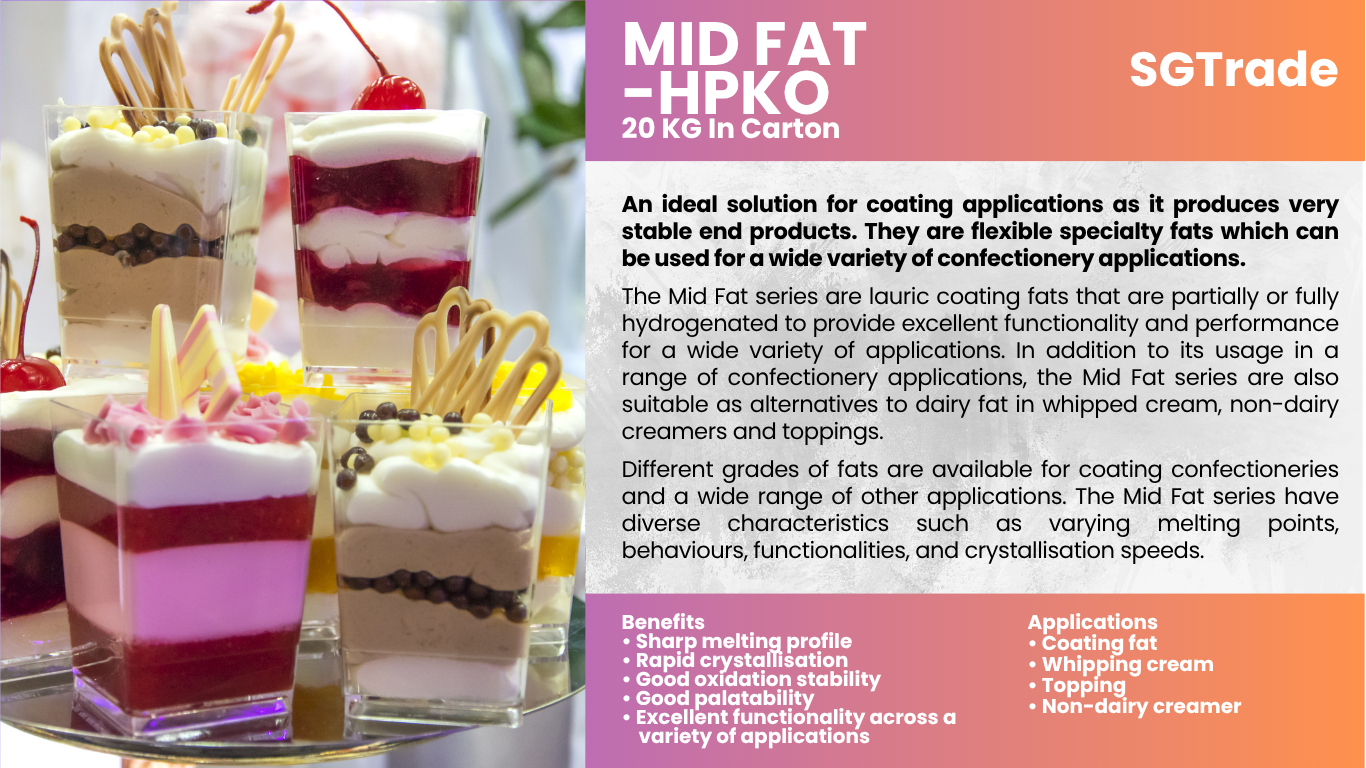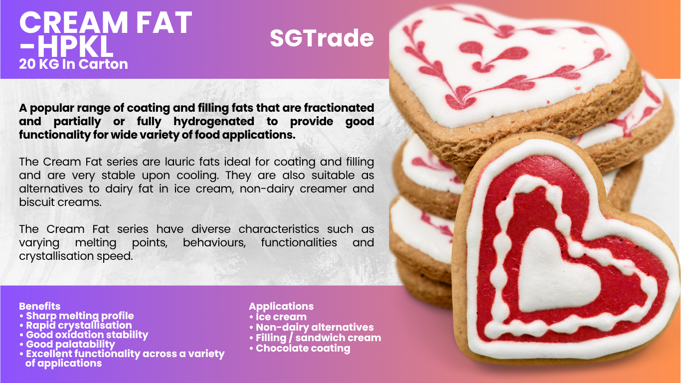 Summit Global Trade offers palm oil–based fat replacers designed to deliver creamy texture, flavor, and stability while promoting healthier formulations in food, bakery, and confectionery products.