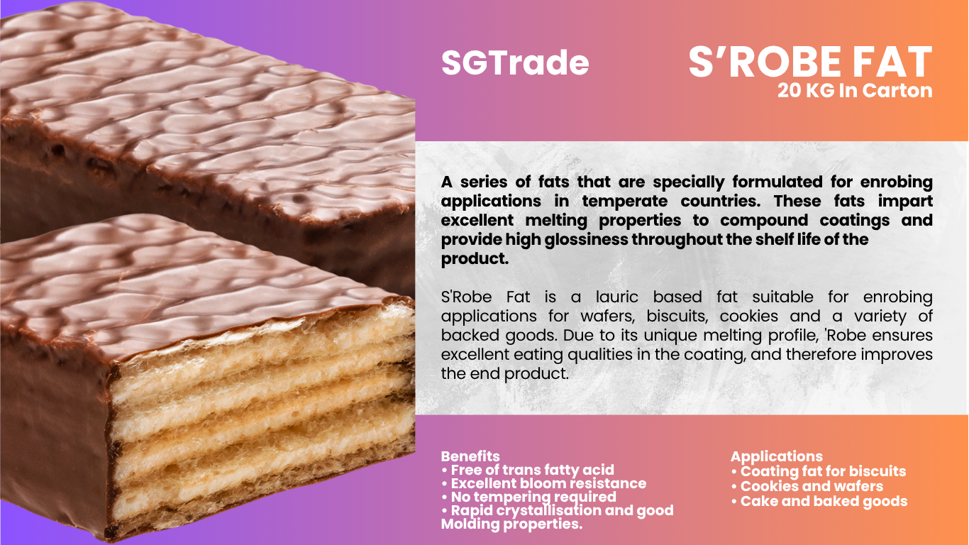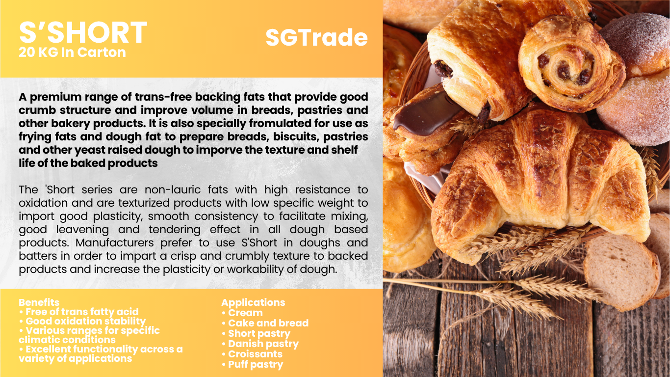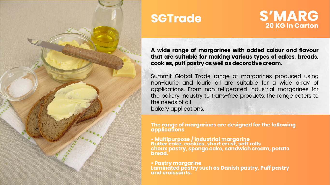 Summit Global Trade offers palm oil–based fats and shortenings for the baking industry, delivering excellent texture, stability, and flavor for breads, pastries, and confectionery products.