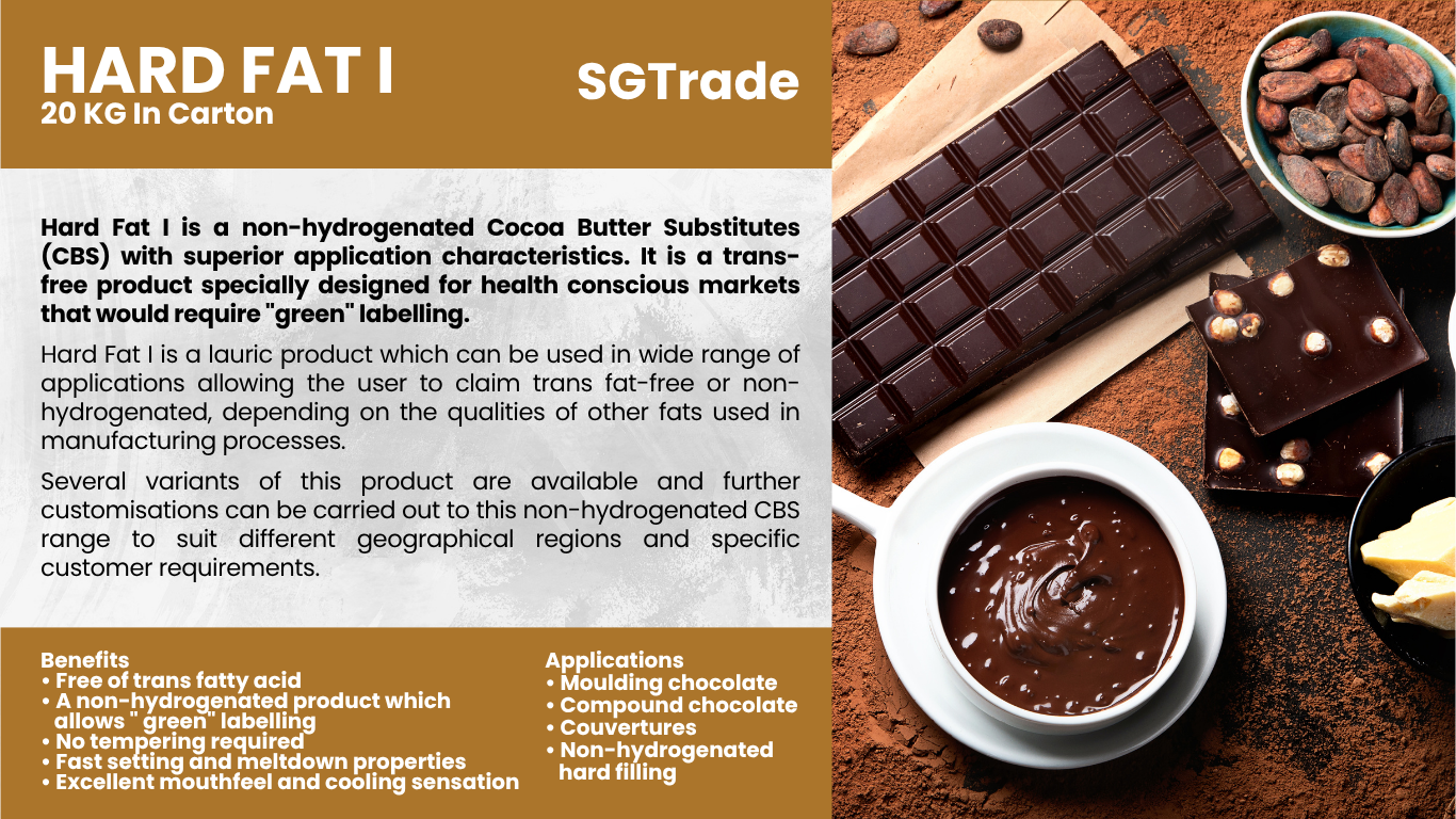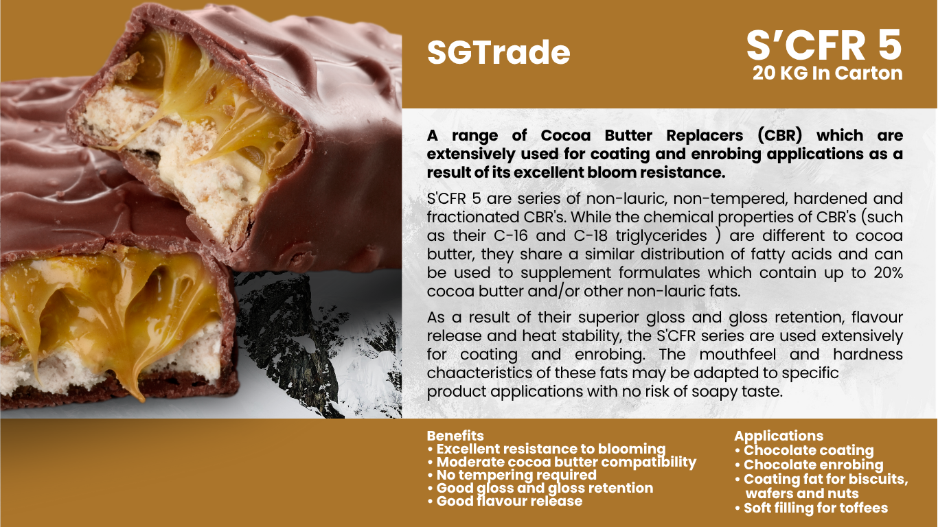 Summit Global Trade supplies palm oil–based cocoa butter replacers and substitutes, providing smooth texture, rich taste, and heat stability for chocolates, coatings, and confectionery applications.