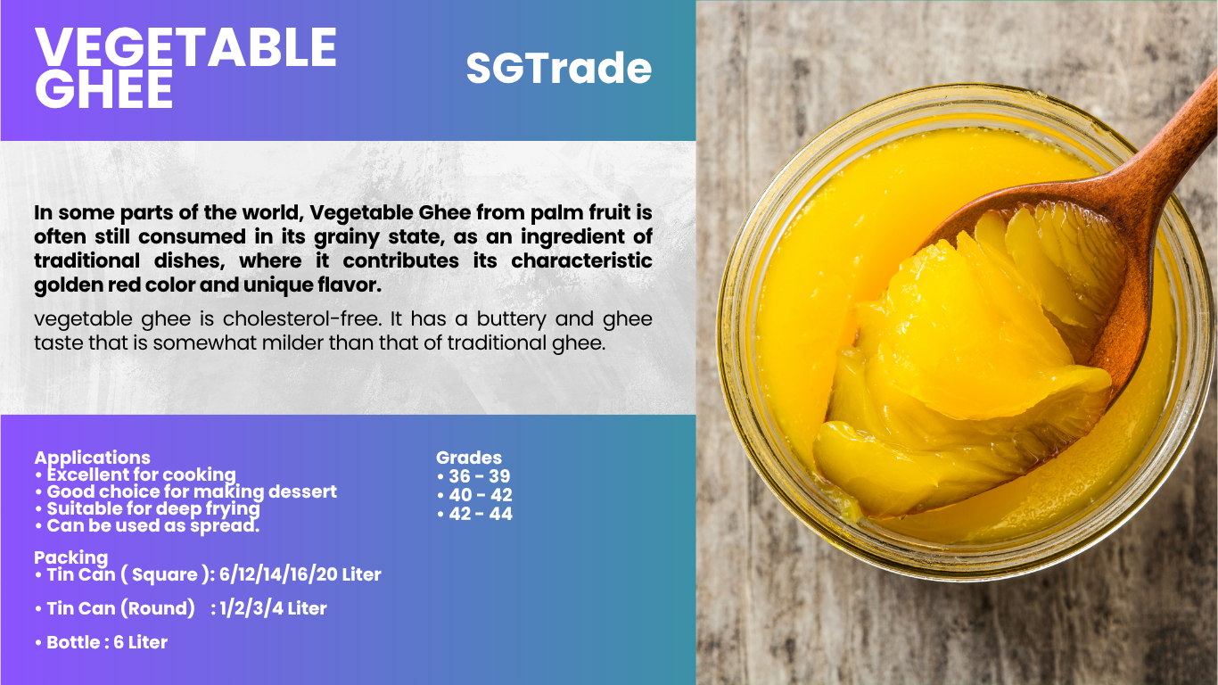 Summit Global Trade provides palm oil–based ghee alternatives and specialty fats, offering rich flavor, aroma, and stability ideal for traditional sweets, baklava, and culinary applications.